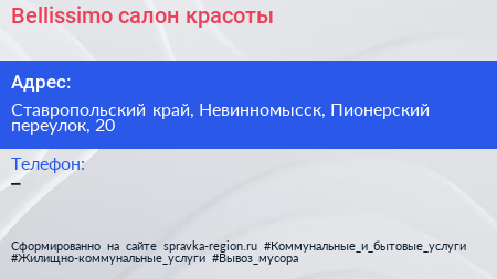 Bellissimo, салон красоты по адресу Ставропольский край, Невинномысск, Пионерский переулок, 20 в дальнейшем Организация, размещена в следующих категориях: