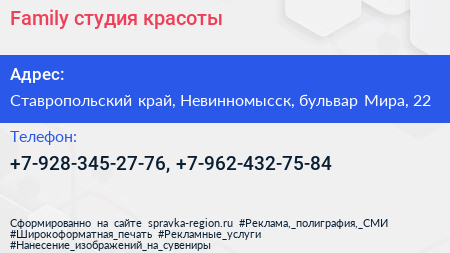 Family, студия красоты по адресу Ставропольский край, Невинномысск, бульвар Мира, 22 в дальнейшем Организация, размещена в следующих категориях: