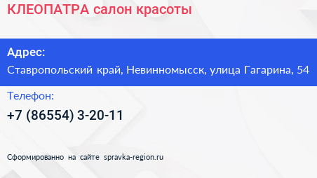 КЛЕОПАТРА, салон красоты по адресу Ставропольский край, Невинномысск, улица Гагарина, 54 в дальнейшем Организация, размещена в следующих категориях: