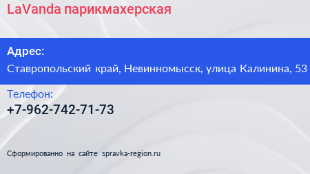 LaVanda, парикмахерская по адресу Ставропольский край, Невинномысск, улица Калинина, 53 в дальнейшем Организация, размещена в следующих категориях: