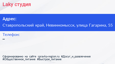 Laky, студия по адресу Ставропольский край, Невинномысск, улица Гагарина, 55 в дальнейшем Организация, размещена в следующих категориях: