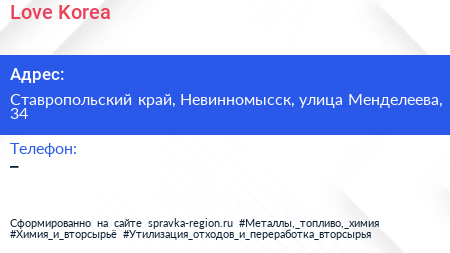 Love Korea по адресу Ставропольский край, Невинномысск, улица Менделеева, 34 в дальнейшем Организация, размещена в следующих категориях: