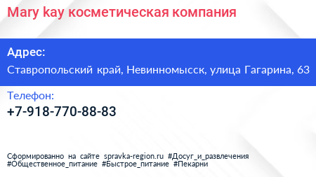 Mary kay, косметическая компания по адресу Ставропольский край, Невинномысск, улица Гагарина, 63 в дальнейшем Организация, размещена в следующих категориях: