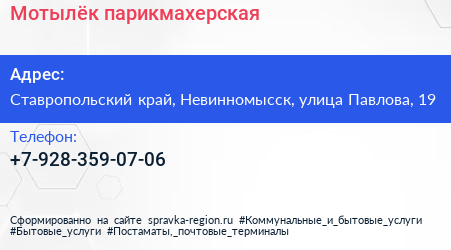 Мотылёк, парикмахерская по адресу Ставропольский край, Невинномысск, улица Павлова, 19 в дальнейшем Организация, размещена в следующих категориях: