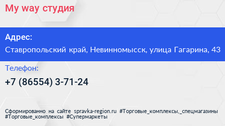 My way, студия по адресу Ставропольский край, Невинномысск, улица Гагарина, 43 в дальнейшем Организация, размещена в следующих категориях: