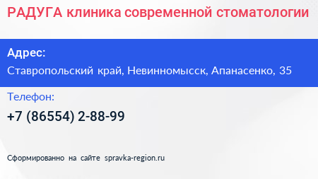 РАДУГА, клиника современной стоматологии по адресу Ставропольский край, Невинномысск, Апанасенко, 35 в дальнейшем Организация, размещена в следующих категориях: