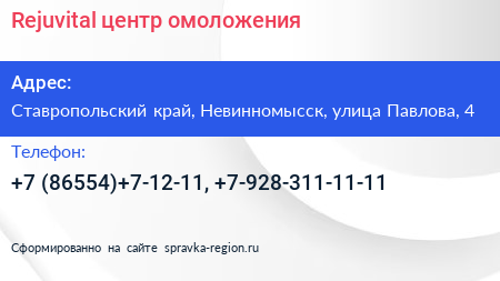 Rejuvital, центр омоложения по адресу Ставропольский край, Невинномысск, улица Павлова, 4 в дальнейшем Организация, размещена в следующих категориях: