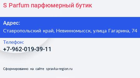 S Parfum, парфюмерный бутик по адресу Ставропольский край, Невинномысск, улица Гагарина, 74 в дальнейшем Организация, размещена в следующих категориях: