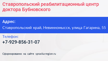 Ставропольский реабилитационный центр доктора Бубновского по адресу Ставропольский край, Невинномысск, улица Гагарина, 55 в дальнейшем Организация, размещена в следующих категориях: