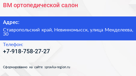 ВМ, ортопедической салон по адресу Ставропольский край, Невинномысск, улица Менделеева, 30 в дальнейшем Организация, размещена в следующих категориях: