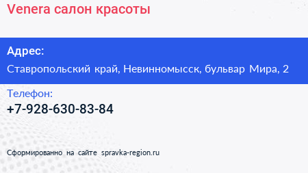 Venera, салон красоты по адресу Ставропольский край, Невинномысск, бульвар Мира, 2 в дальнейшем Организация, размещена в следующих категориях: