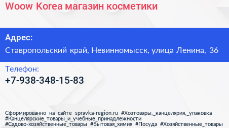 Woow Korea, магазин косметики по адресу Ставропольский край, Невинномысск, улица Ленина, 36 в дальнейшем Организация, размещена в следующих категориях: