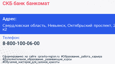 СКБ-банк, банкомат по адресу Свердловская область, Невьянск, Октябрьский проспект, 2 к2 в дальнейшем Организация, размещена в следующих категориях: