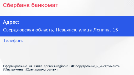 Сбербанк, банкомат по адресу Свердловская область, Невьянск, улица Ленина, 15 в дальнейшем Организация, размещена в следующих категориях: