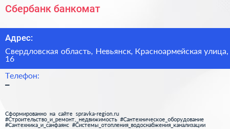 Сбербанк, банкомат по адресу Свердловская область, Невьянск, Красноармейская улица, 16 в дальнейшем Организация, размещена в следующих категориях: