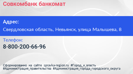 Совкомбанк, банкомат по адресу Свердловская область, Невьянск, улица Малышева, 8 в дальнейшем Организация, размещена в следующих категориях: