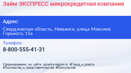 Займ ЭКСПРЕСС, микрокредитная компания по адресу Свердловская область, Невьянск, улица Максима Горького, 15а в дальнейшем Организация, размещена в следующих категориях: