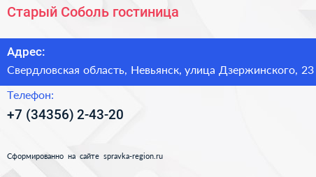 Старый Соболь, гостиница по адресу Свердловская область, Невьянск, улица Дзержинского, 23 в дальнейшем Организация, размещена в следующих категориях: