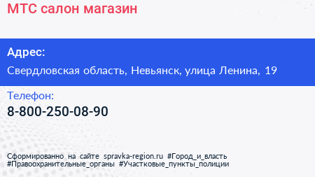 МТС, салон-магазин по адресу Свердловская область, Невьянск, улица Ленина, 19 в дальнейшем Организация, размещена в следующих категориях: