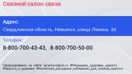 Связной, салон связи по адресу Свердловская область, Невьянск, улица Ленина, 26 в дальнейшем Организация, размещена в следующих категориях:
