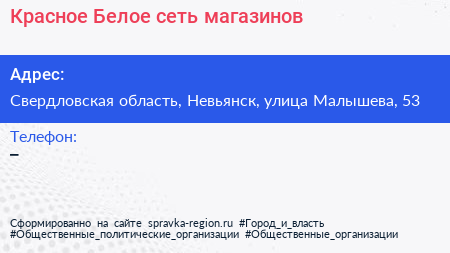 Красное & Белое, сеть магазинов по адресу Свердловская область, Невьянск, улица Малышева, 53 в дальнейшем Организация, размещена в следующих категориях: