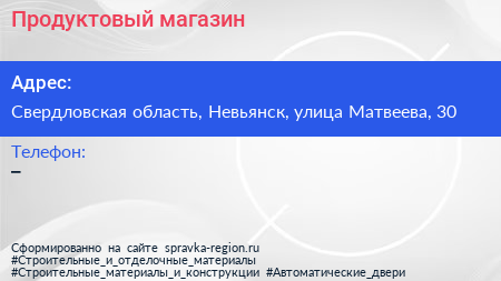 Продуктовый магазин по адресу Свердловская область, Невьянск, улица Матвеева, 30 в дальнейшем Организация, размещена в следующих категориях: