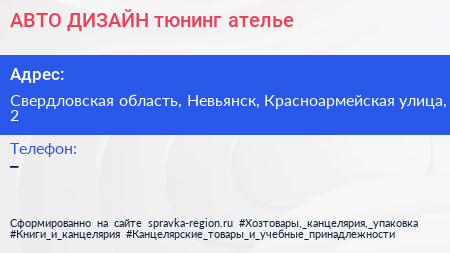 АВТО ДИЗАЙН, тюнинг-ателье по адресу Свердловская область, Невьянск, Красноармейская улица, 2 в дальнейшем Организация, размещена в следующих категориях: