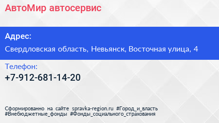 АвтоМир, автосервис по адресу Свердловская область, Невьянск, Восточная улица, 4 в дальнейшем Организация, размещена в следующих категориях:
