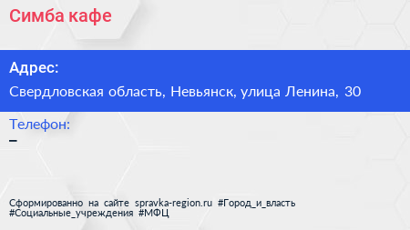 Симба, кафе по адресу Свердловская область, Невьянск, улица Ленина, 30 в дальнейшем Организация, размещена в следующих категориях: