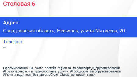 Столовая №6 по адресу Свердловская область, Невьянск, улица Матвеева, 20 в дальнейшем Организация, размещена в следующих категориях:
