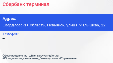 Сбербанк, терминал по адресу Свердловская область, Невьянск, улица Малышева, 12 в дальнейшем Организация, размещена в следующих категориях: