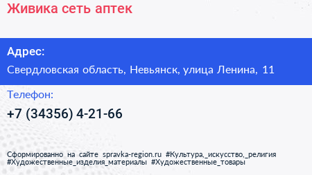 Живика, сеть аптек по адресу Свердловская область, Невьянск, улица Ленина, 11 в дальнейшем Организация, размещена в следующих категориях: