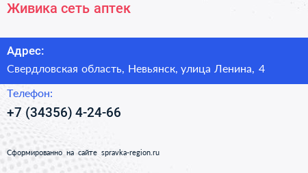 Живика, сеть аптек по адресу Свердловская область, Невьянск, улица Ленина, 4 в дальнейшем Организация, размещена в следующих категориях: