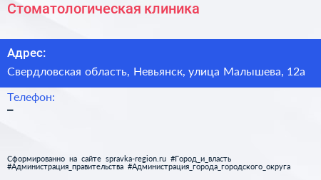 Стоматологическая клиника по адресу Свердловская область, Невьянск, улица Малышева, 12а в дальнейшем Организация, размещена в следующих категориях: