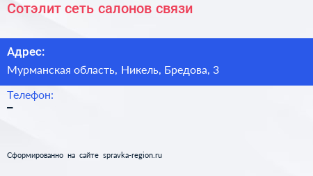 Сотэлит, сеть салонов связи по адресу Мурманская область, Никель, Бредова, 3 в дальнейшем Организация, размещена в следующих категориях: