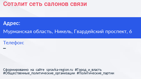 Сотэлит, сеть салонов связи по адресу Мурманская область, Никель, Гвардейский проспект, 6 в дальнейшем Организация, размещена в следующих категориях: