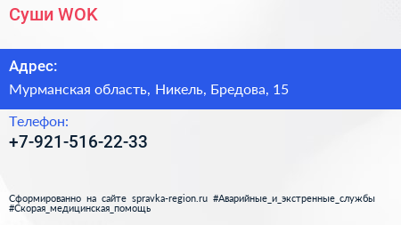 Суши WOK по адресу Мурманская область, Никель, Бредова, 15 в дальнейшем Организация, размещена в следующих категориях: