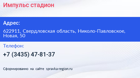 Импульс, стадион по адресу 622911, Свердловская область, Николо-Павловское, Новая, 50 в дальнейшем Организация, размещена в следующих категориях: