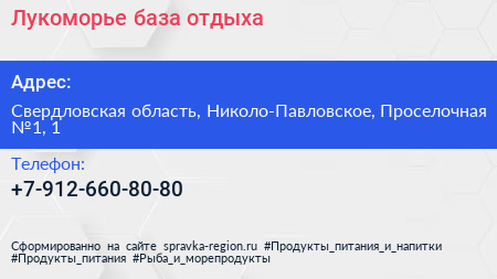 Лукоморье, база отдыха по адресу Свердловская область, Николо-Павловское, Проселочная №1, 1 в дальнейшем Организация, размещена в следующих категориях: