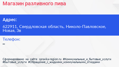 Магазин разливного пива по адресу 622911, Свердловская область, Николо-Павловское, Новая, 3в в дальнейшем Организация, размещена в следующих категориях: