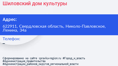 Шиловский дом культуры по адресу 622911, Свердловская область, Николо-Павловское, Ленина, 34а в дальнейшем Организация, размещена в следующих категориях: