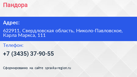 Пандора по адресу 622911, Свердловская область, Николо-Павловское, Карла Маркса, 111 в дальнейшем Организация, размещена в следующих категориях: