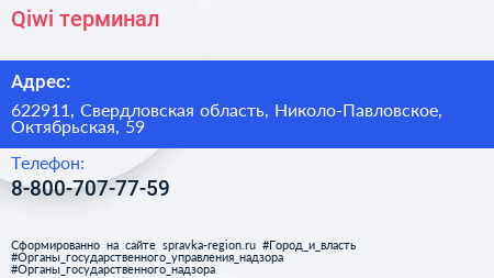 Qiwi, терминал по адресу 622911, Свердловская область, Николо-Павловское, Октябрьская, 59 в дальнейшем Организация, размещена в следующих категориях: