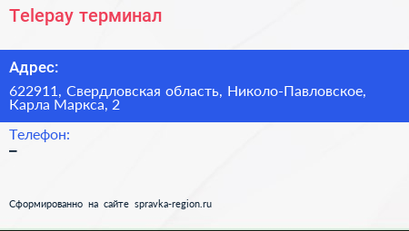 Telepay, терминал по адресу 622911, Свердловская область, Николо-Павловское, Карла Маркса, 2 в дальнейшем Организация, размещена в следующих категориях: