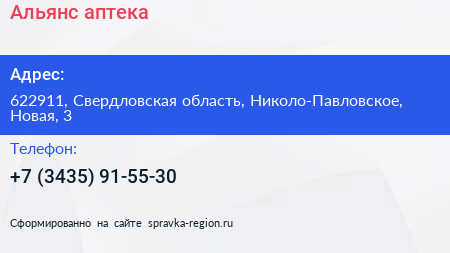 Альянс, аптека по адресу 622911, Свердловская область, Николо-Павловское, Новая, 3 в дальнейшем Организация, размещена в следующих категориях: