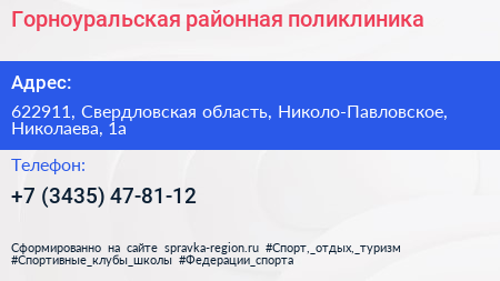 Горноуральская районная поликлиника по адресу 622911, Свердловская область, Николо-Павловское, Николаева, 1а в дальнейшем Организация, размещена в следующих категориях: