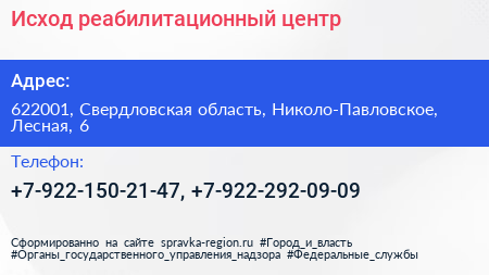 Исход, реабилитационный центр по адресу 622001, Свердловская область, Николо-Павловское, Лесная, 6 в дальнейшем Организация, размещена в следующих категориях: