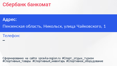 Сбербанк, банкомат по адресу Пензенская область, Никольск, улица Чайковского, 1 в дальнейшем Организация, размещена в следующих категориях: