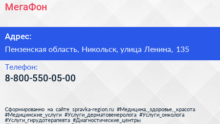 МегаФон по адресу Пензенская область, Никольск, улица Ленина, 135 в дальнейшем Организация, размещена в следующих категориях: