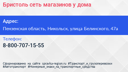 Бристоль, сеть магазинов у дома по адресу Пензенская область, Никольск, улица Белинского, 47а в дальнейшем Организация, размещена в следующих категориях:
